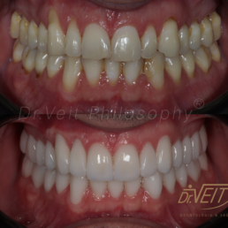 Paciente com queixa estética devido a fraturas, fissuras e retrações gengivais, coloração amarelada dos dentes e manchas.