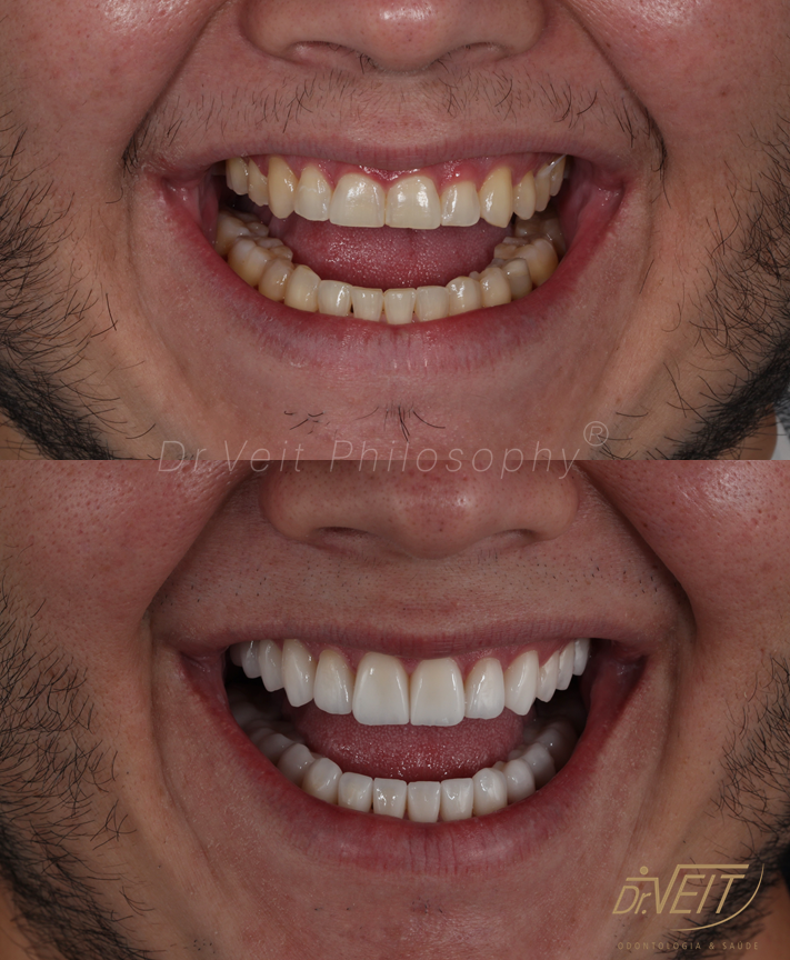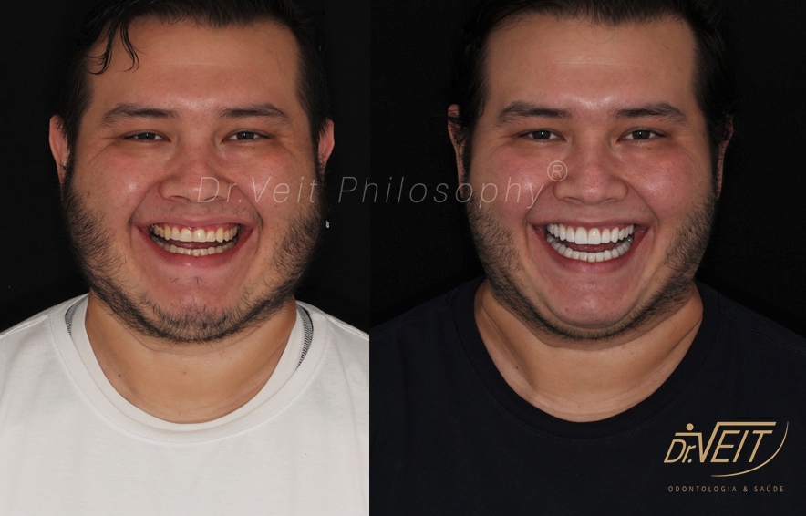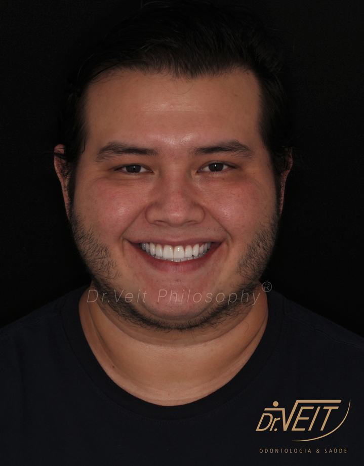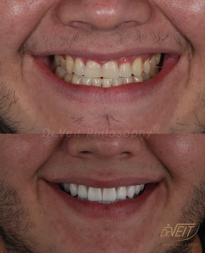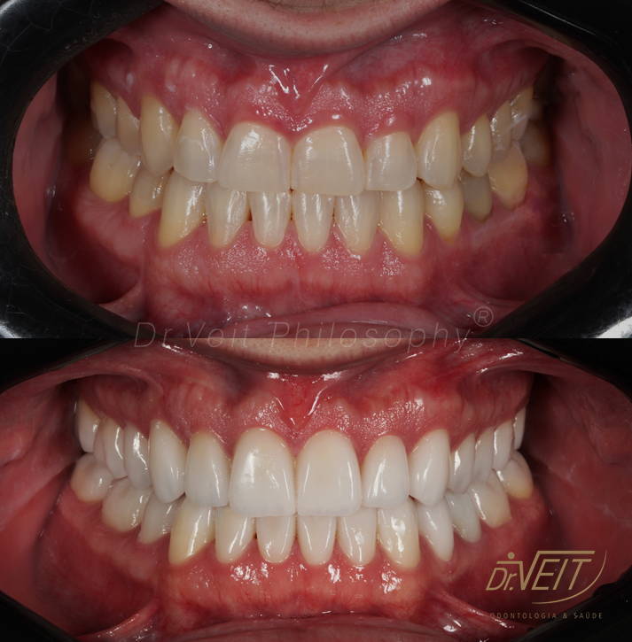 Paciente com queixa estética devido aos dentes da frente curtos e pequenos e a irregularidade do contorno gengival. Buscava melhorar seu sorriso, restabelecer a proporção dos dentes e coloração mais clara.