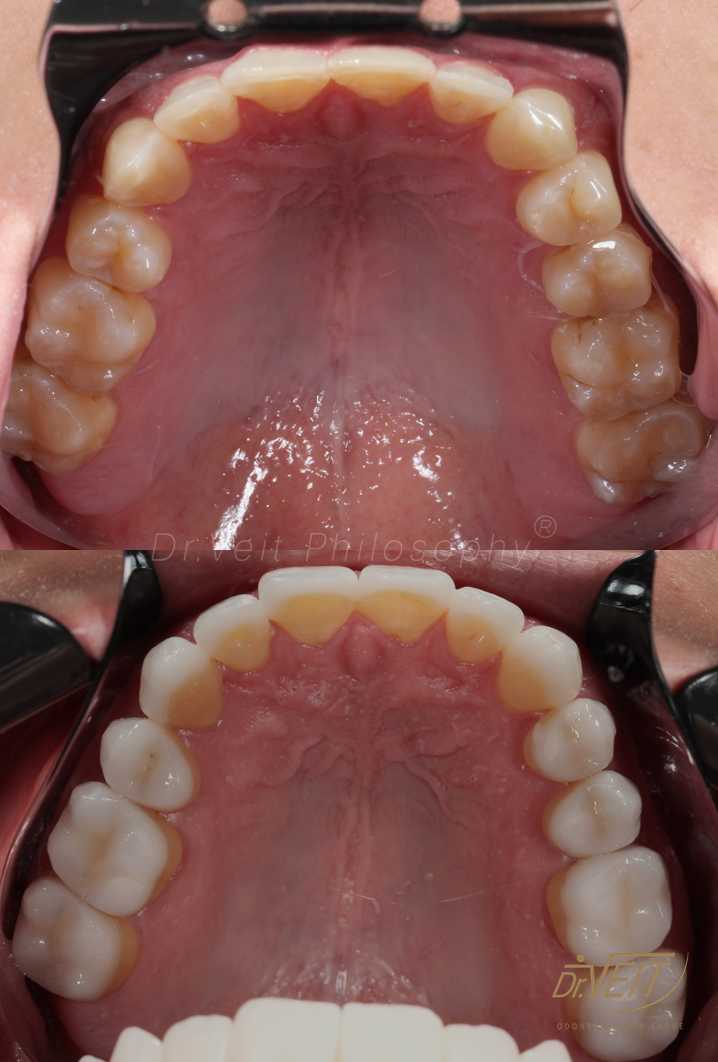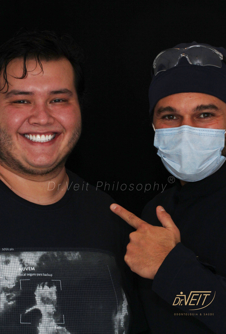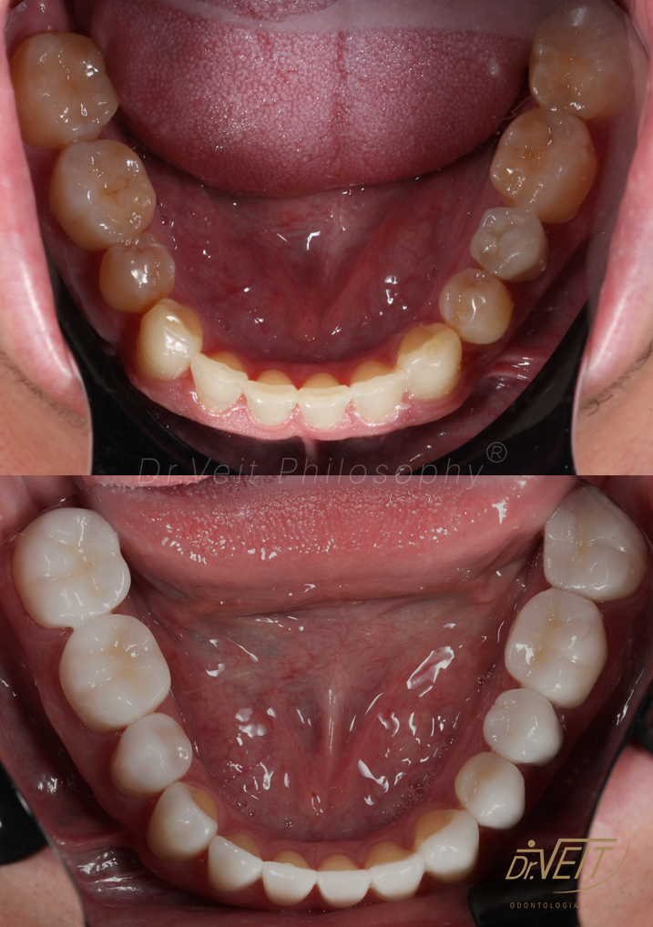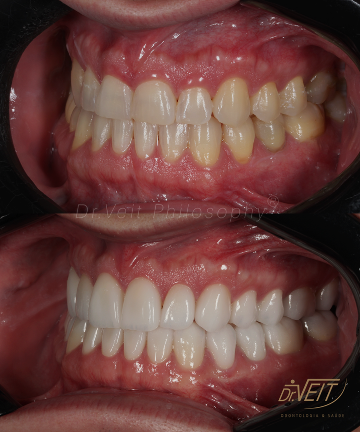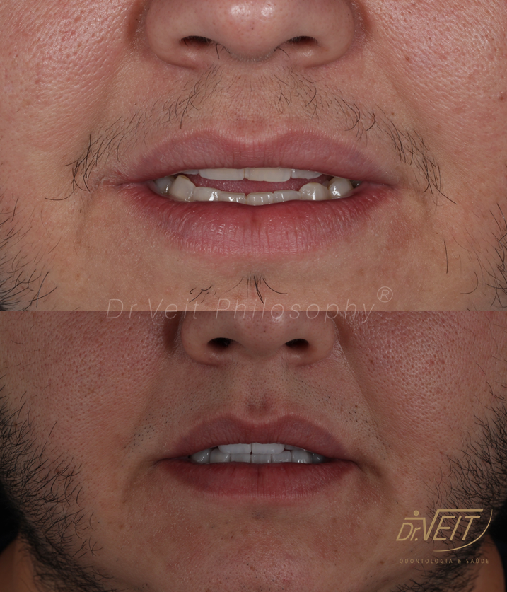 Paciente com queixa estética devido aos dentes da frente curtos e pequenos e a irregularidade do contorno gengival. Buscava melhorar seu sorriso, restabelecer a proporção dos dentes e coloração mais clara.