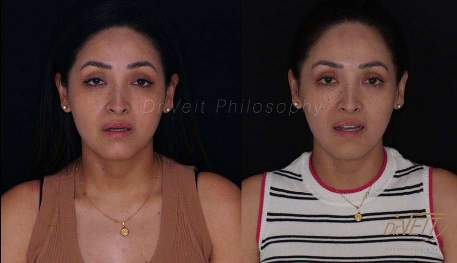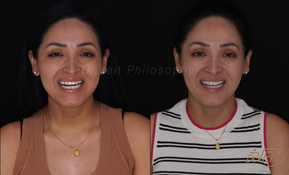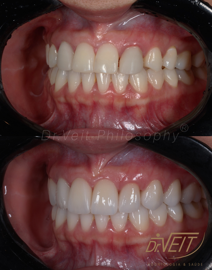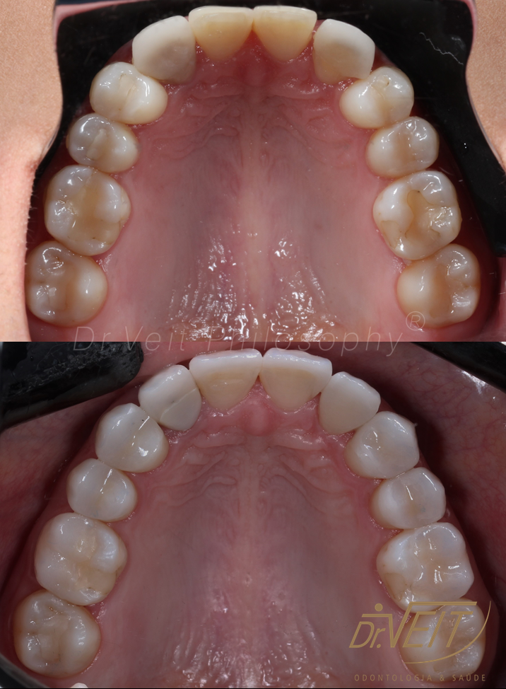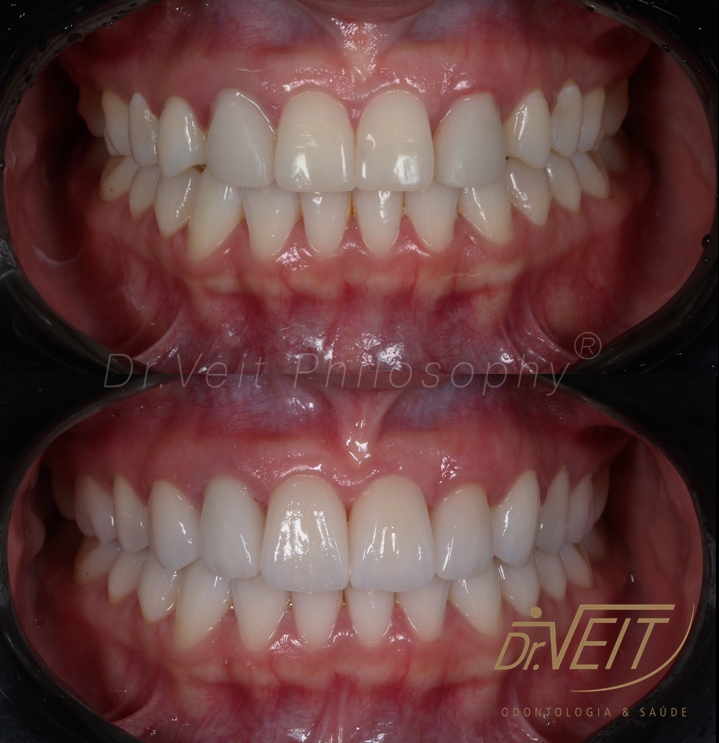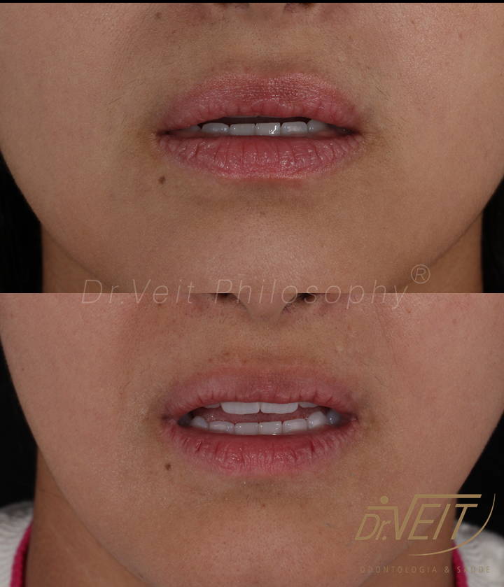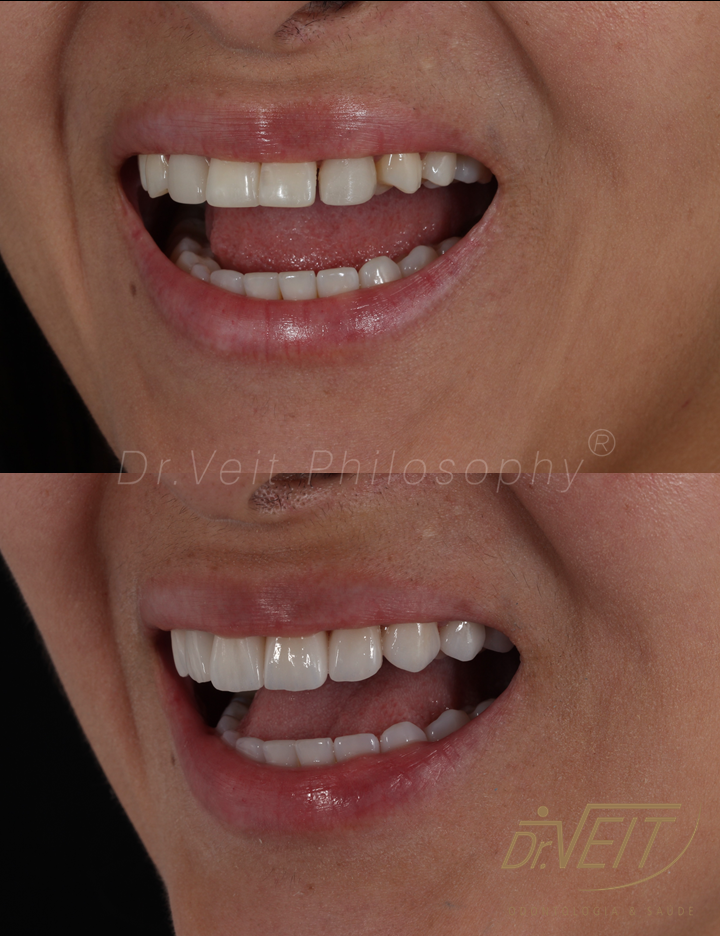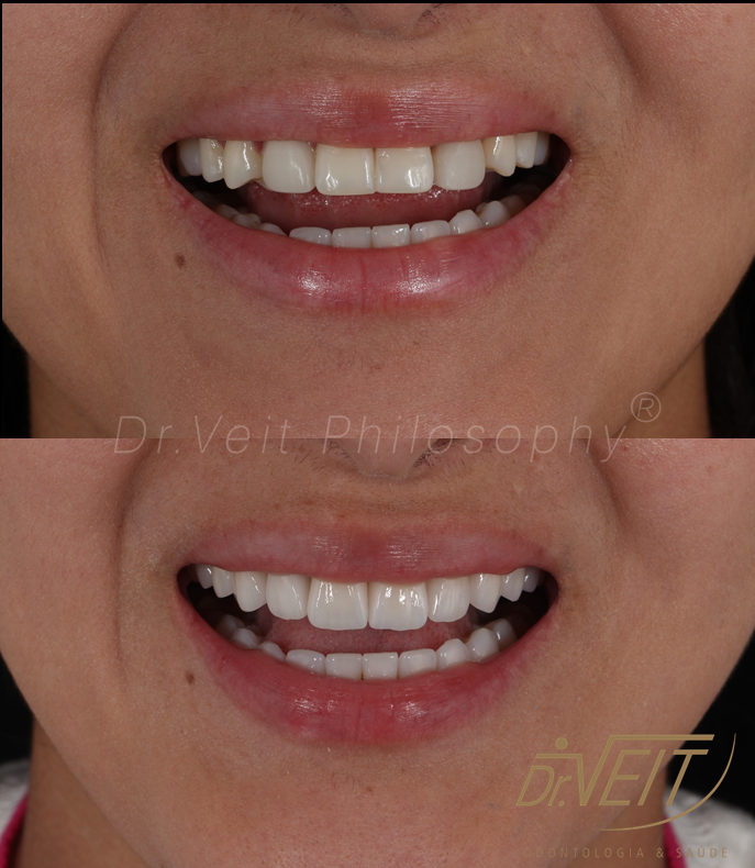 Paciente apresentava queixa estética devido a falta de dois dentes na região anterior. Para camuflar o problema, os dentes da região de trás foram trazidos para frente, fechando os espaços. As restaurações realizadas anteriormente nos incisivos laterais não entregaram à paciente a harmonia e equilíbrio necessário.