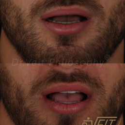Apresentava grandes desgastes e fraturas dos dentes de toda a arcada dentária devido traumas e apertamento dos dentes, buscava restabelecer a estética do seu sorriso.