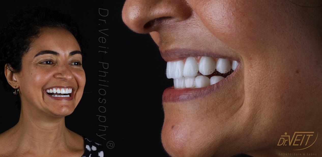 Reabilitação Oral Transdisciplinar, logrando longevidade, estética, naturalidade. Equilíbrio funcional e estético recuperado com lentes de contato dentais, este tratamento foi realizado de forma transdisciplinar, envolvendo todas as especialidades, recuperando a saúde dos dentes, dos ossos e gengiva, além do equilíbrio da mordida.