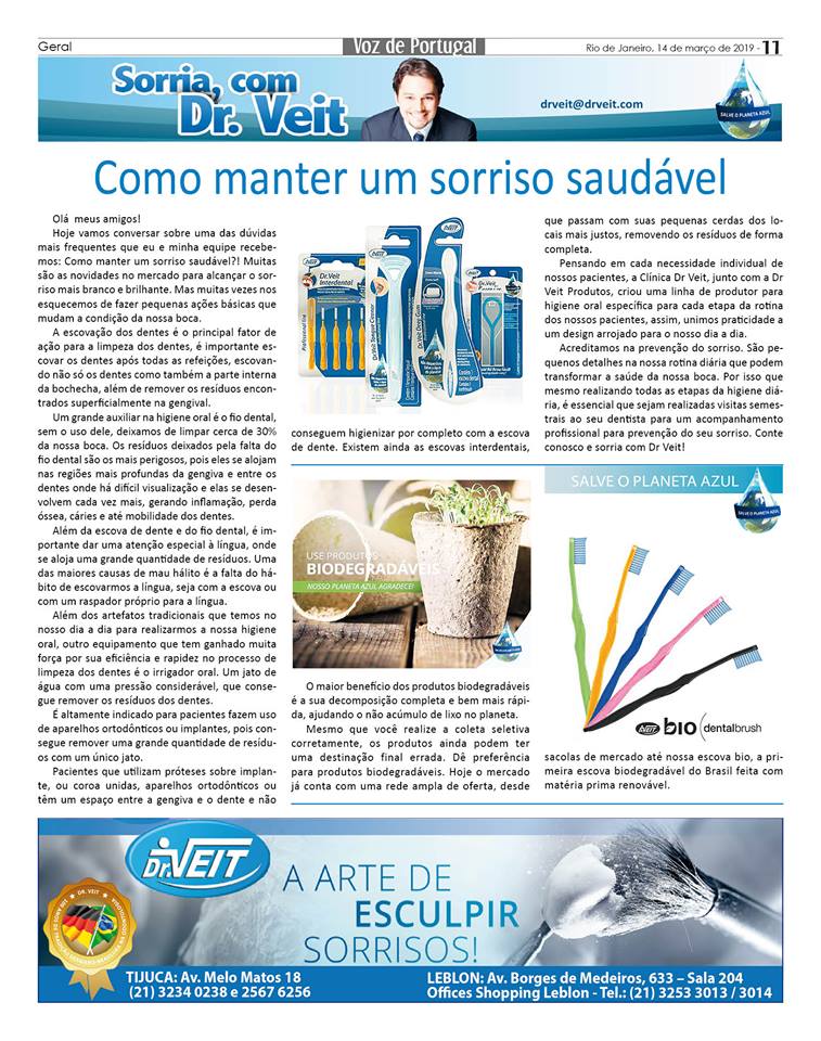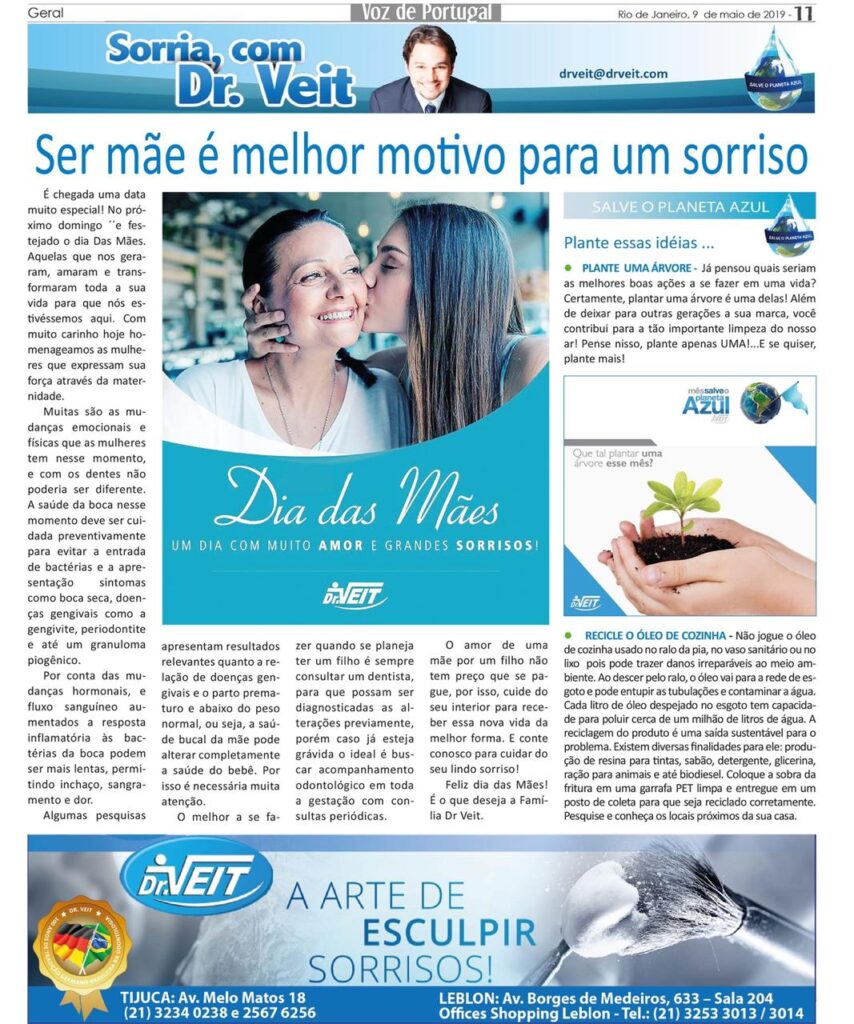 Confira a matéria do Jornal Voz de Portugal, em que Dr. Veit fala sobre a importância dos cuidados da saúde bucal da mulher que pretende se tornar mãe para que seu corpo esteja preparado para receber a criança e para, assim, começar a protegê-la antes mesmo do nascimento.