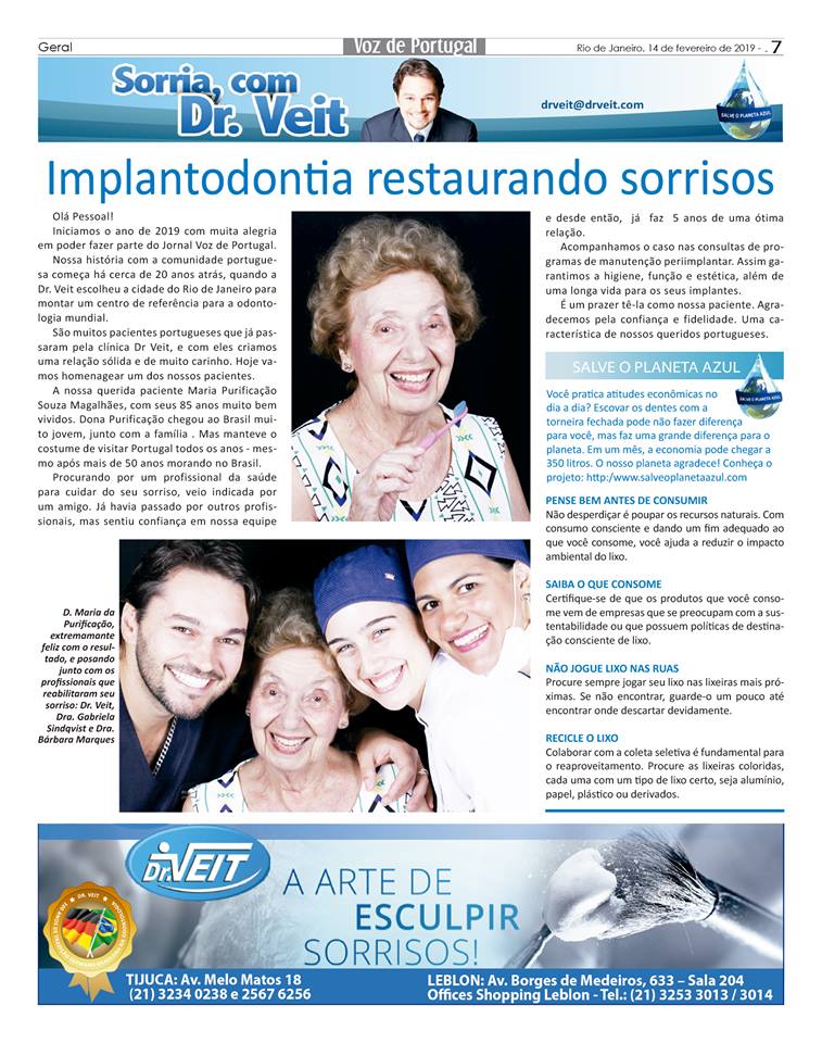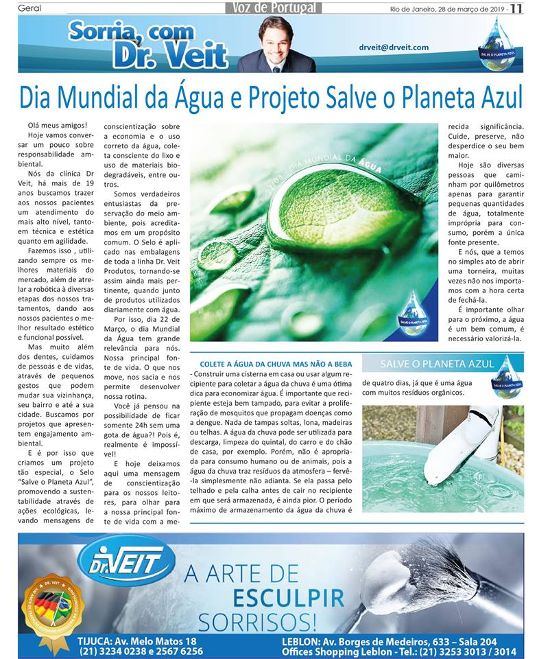 Nesta matéria do Jornal Voz de Portugal, o Dr. Veit conta sobre o seu projeto de incentivo às práticas ecologicamente corretas que contribuem para o futuro do planeta, além de dicas para evitar o desperdício de água e a importância que devemos dar a esse recurso natural. Confira!
