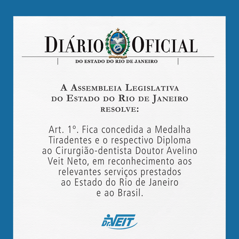 A família Dr. Veit parabeniza o Diretor do Grupo Dr. Veit Odontologia & Saúde, Dr. Avelino Veit, por receber a Medalha Tiradentes, uma honraria concedida a personalidades que prestaram serviços de grande importância para a sociedade. A cerimônia de entrega será realizada no dia 28 de Maio, às 14h, no Plenário Barbosa Lima Sobrinho, do […]